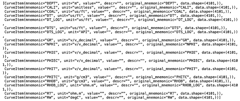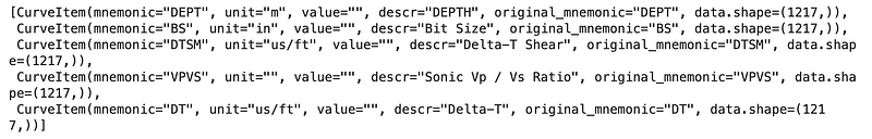 - Information about each log curve, including units, descriptions and mnemonics