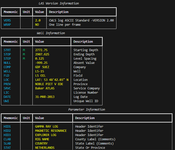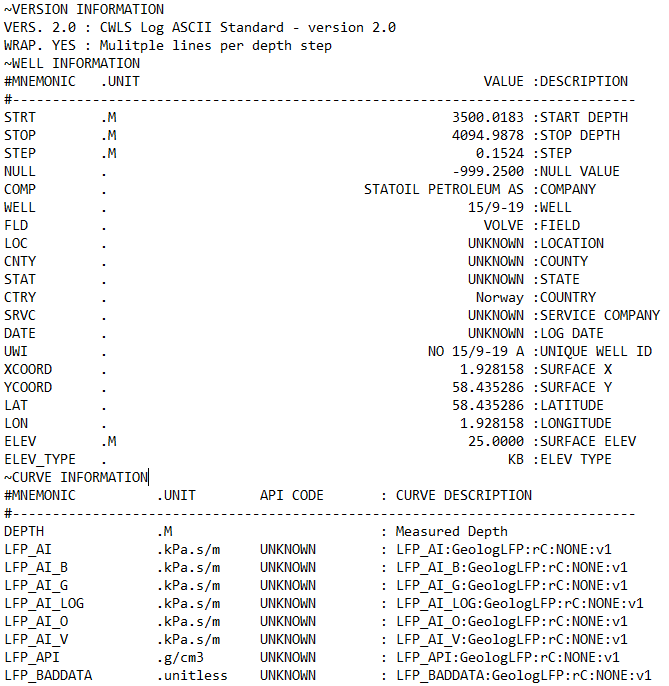 ~V— Version information: This tells you what version the LAS file is written in and how the rest of the file should be interpreted.~W— Well information: This section contains metadata about the well and the logging run, not the logs themselves. This includes the location of the well, start and stop depth of the file, field name.~C— Curve information: This section defines what each curve actually is and is split into: Curve Mnemonic, Units and a Short Description~P— Parameters: This section provides information about run-level parameters, tool settings, environmental corrections and processing constants. However, this section is not always present.~O— Other information: This section can include processing comments, notes from the logging engineer, remarks. This section may also be left blank or absent from the file.~A— ASCII data: This is the section that contains all of the measurements for the curves listed in the~Csection. Each row represents one depth level. In some instances data rows can be wrapped to reduce the amount of horizontal scrolling required.