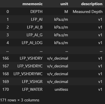 from rich.table import TableWe can take the curve metadata already exposed by lasio and render it as a formatted table: