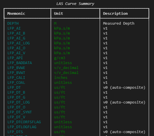 Once you start inspecting LAS files regularly, printing curve metadata line by line gets old quickly. It works, but it’s not especially readable, particularly when you’re dealing with dozens of curves or comparing files.